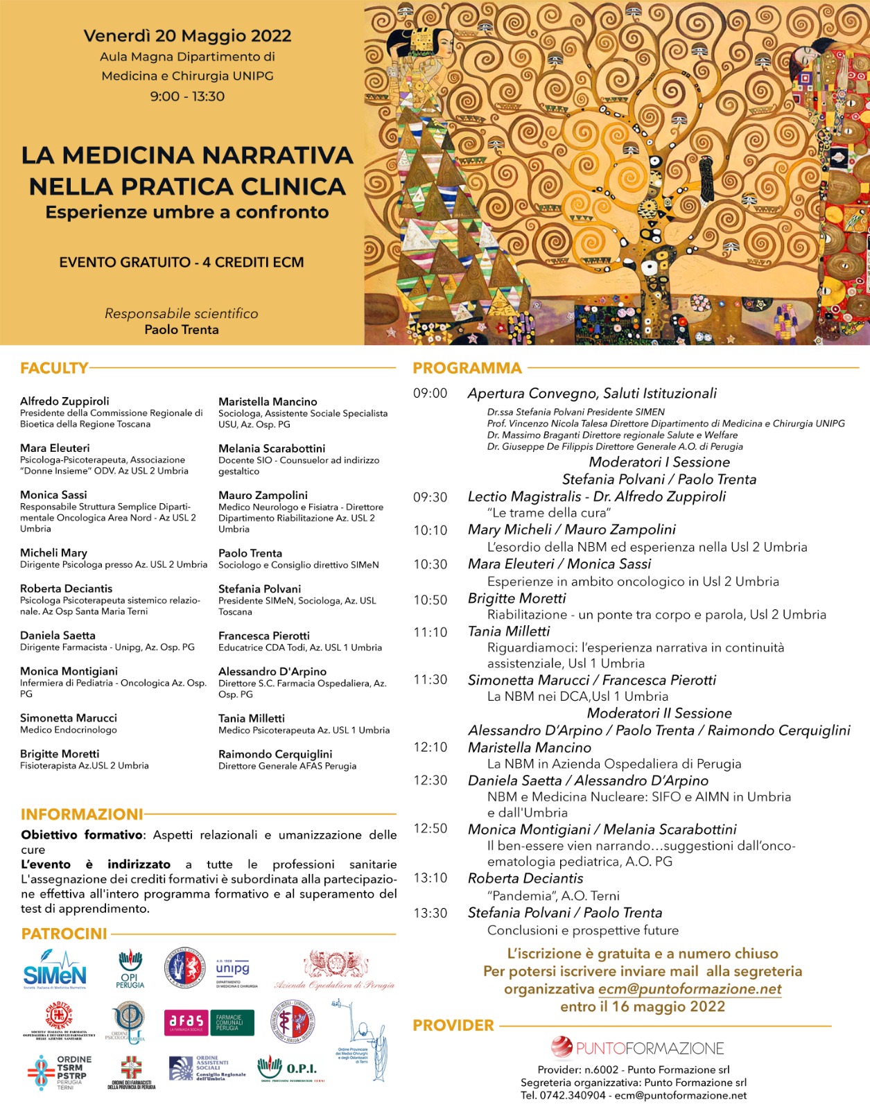 Si svolgerà Venerdì’ 20 maggio nella prestigiosa Aula Magna del Dipartimento di Medicina e Chirurgia dell’Università degli Studi di Perugia il Convegno “ La Medicina Narrativa nella pratica clinica: esperienze umbre a confronto” ad onorare l’esordio avvenuto dieci anni fa a Foligno, nel 2012, e che da lì in poi ha permesso una ricchezza di tante esperienze professionali ad opera dei vari professionisti medici, sanitari, sociali ed educativi in tutte le 4 aziende sanitarie dell’Umbria.